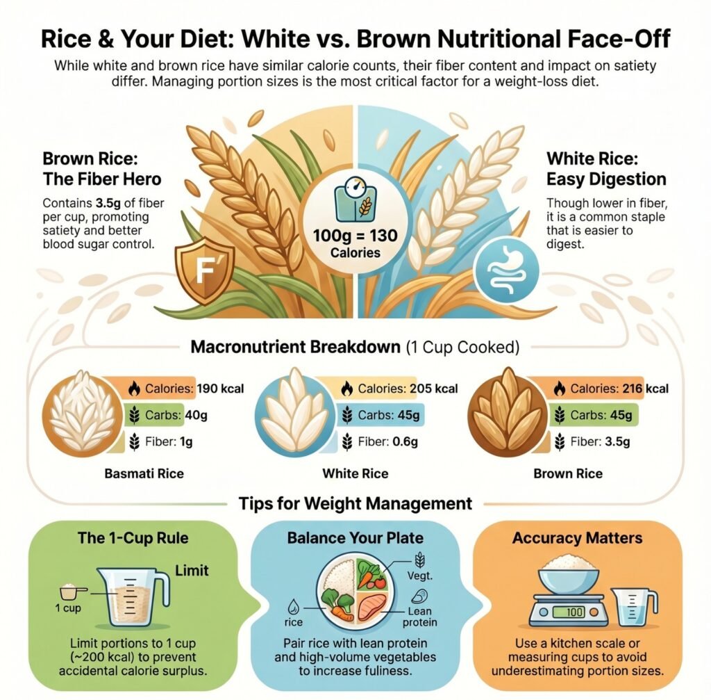 Rice is a staple food that can easily fit into a healthy diet when consumed in the right portions. While white and brown rice have similar calorie counts, brown rice offers more fiber and better satiety, making it a great option for weight loss.
